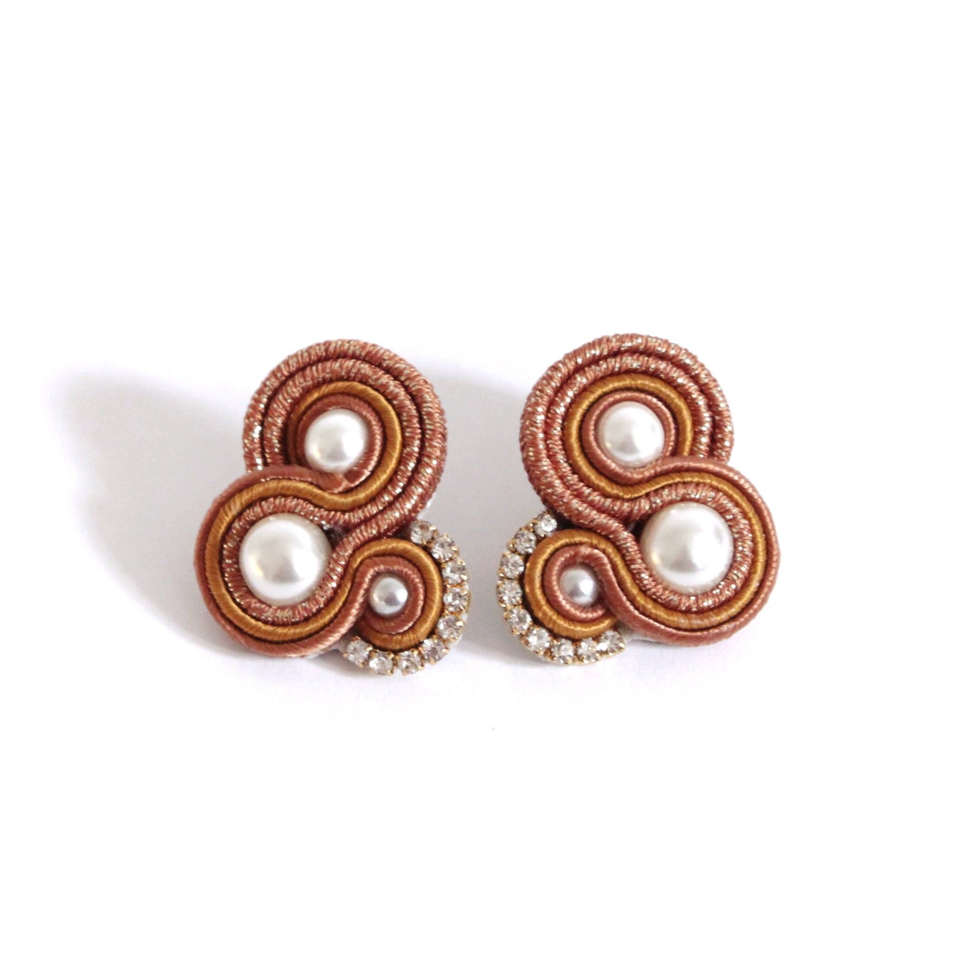 Orecchini realizzati in tecnica soutache, con piattine di seta nelle sfumature del ruggine e senape con pagliuzze dorate, perle di vetro e catena strass Swarovski.