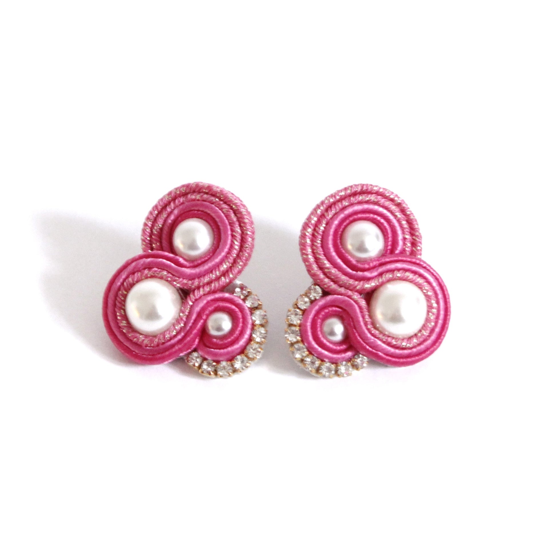 Orecchini realizzati in tecnica soutache, con piattine di seta nelle sfumature del rosa fucsia con pagliuzze dorate, perle di vetro e catena strass Swarovski.