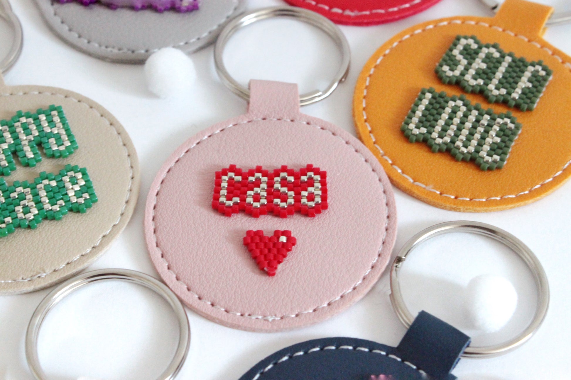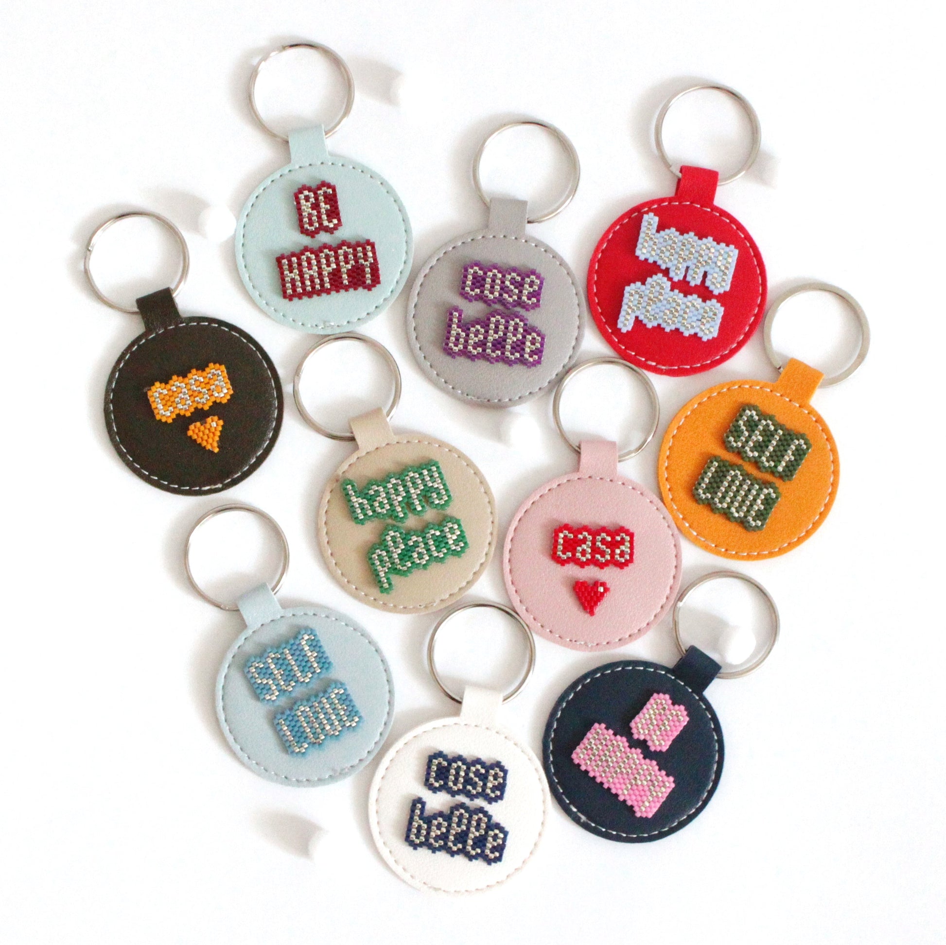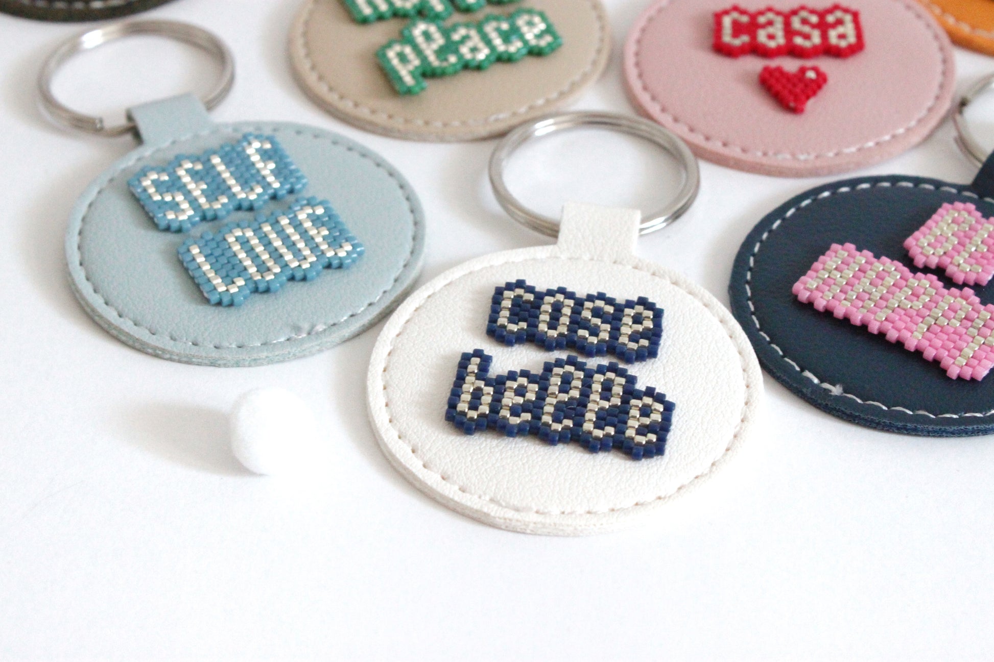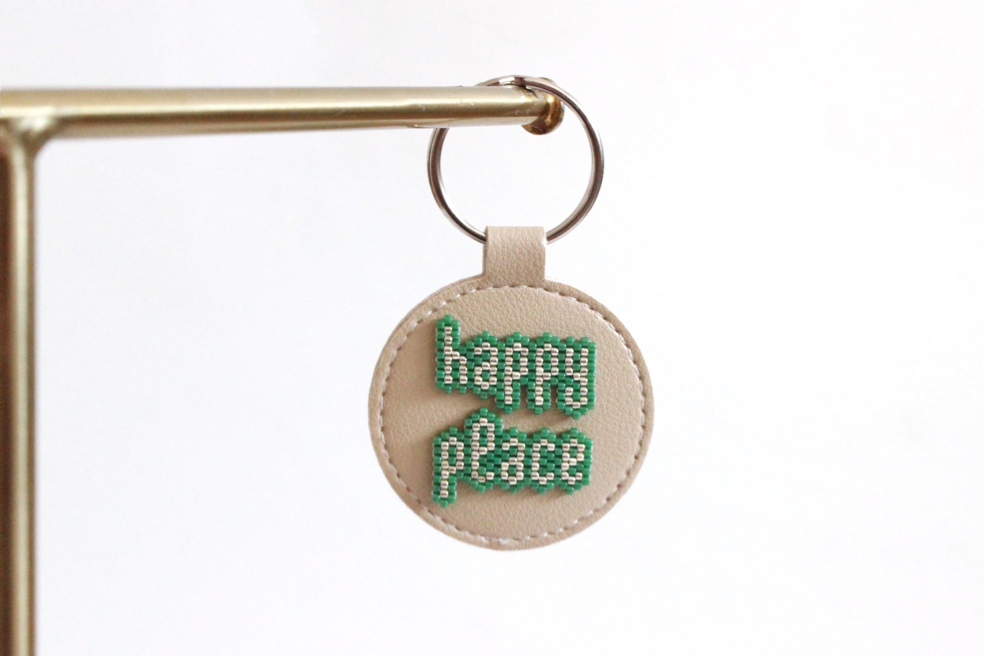 Portachiavi in ecopelle tondo, con parola o frase motivazionale da portare sempre con te, in tessitura di perline giapponesi.