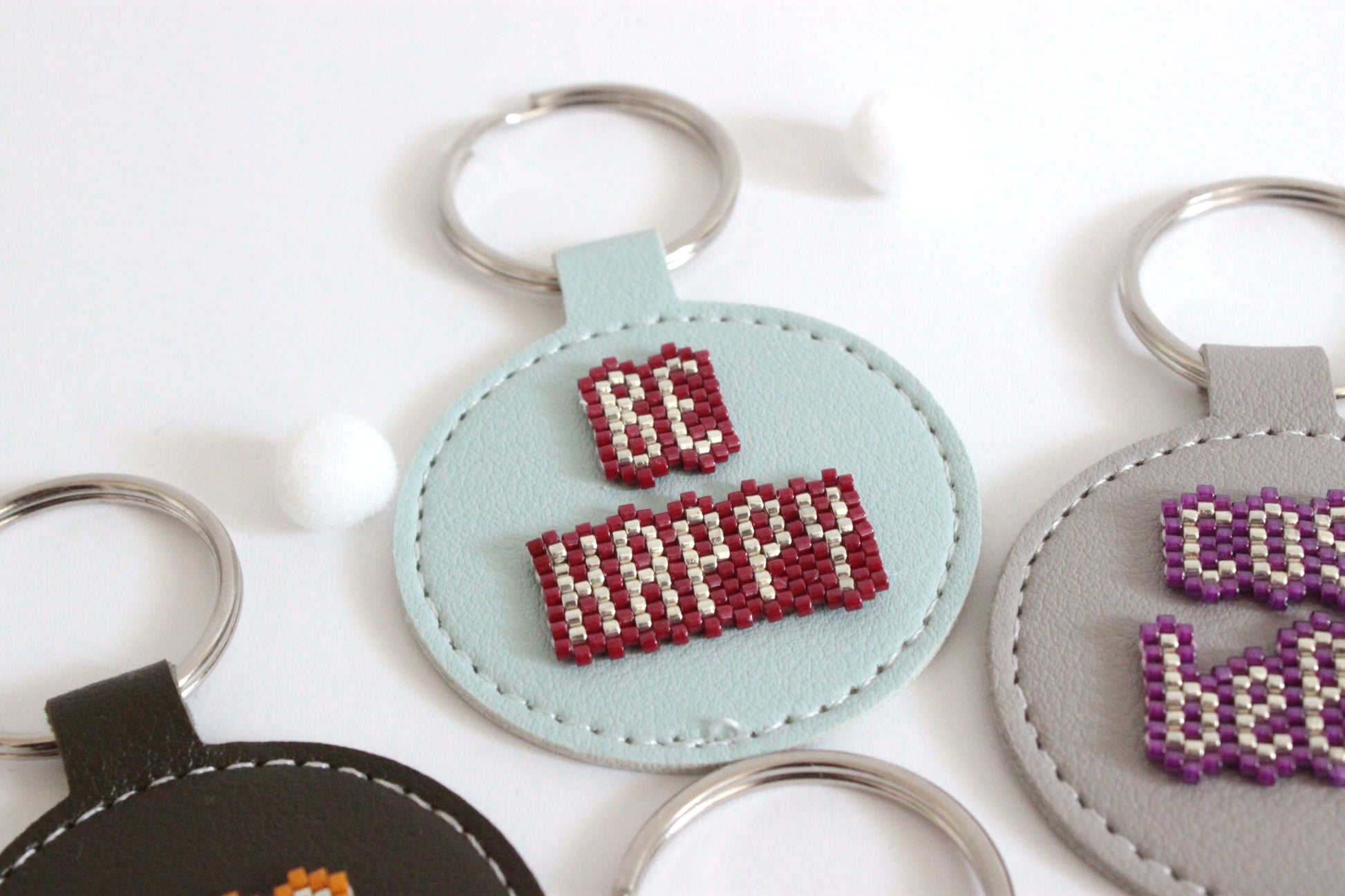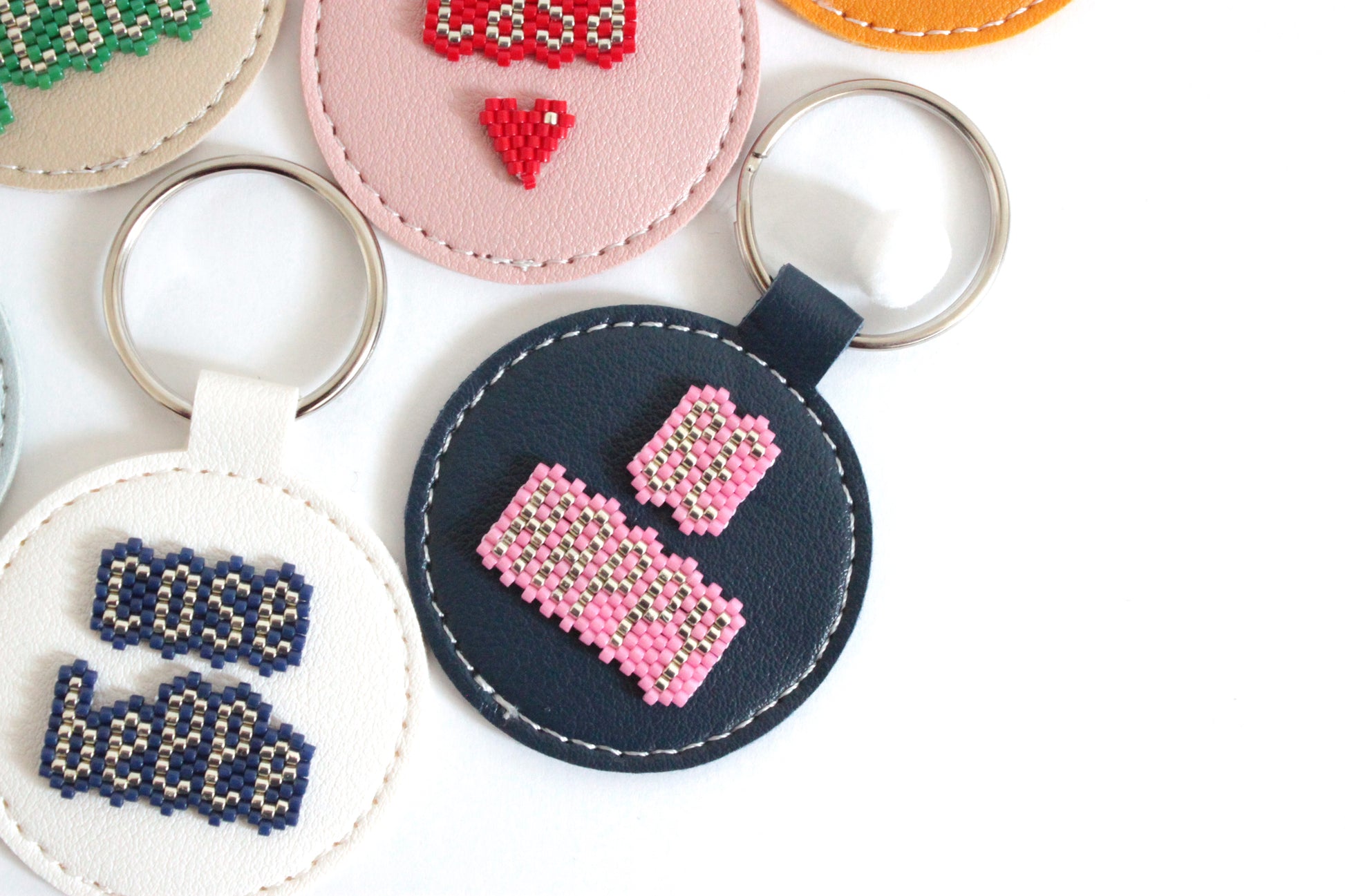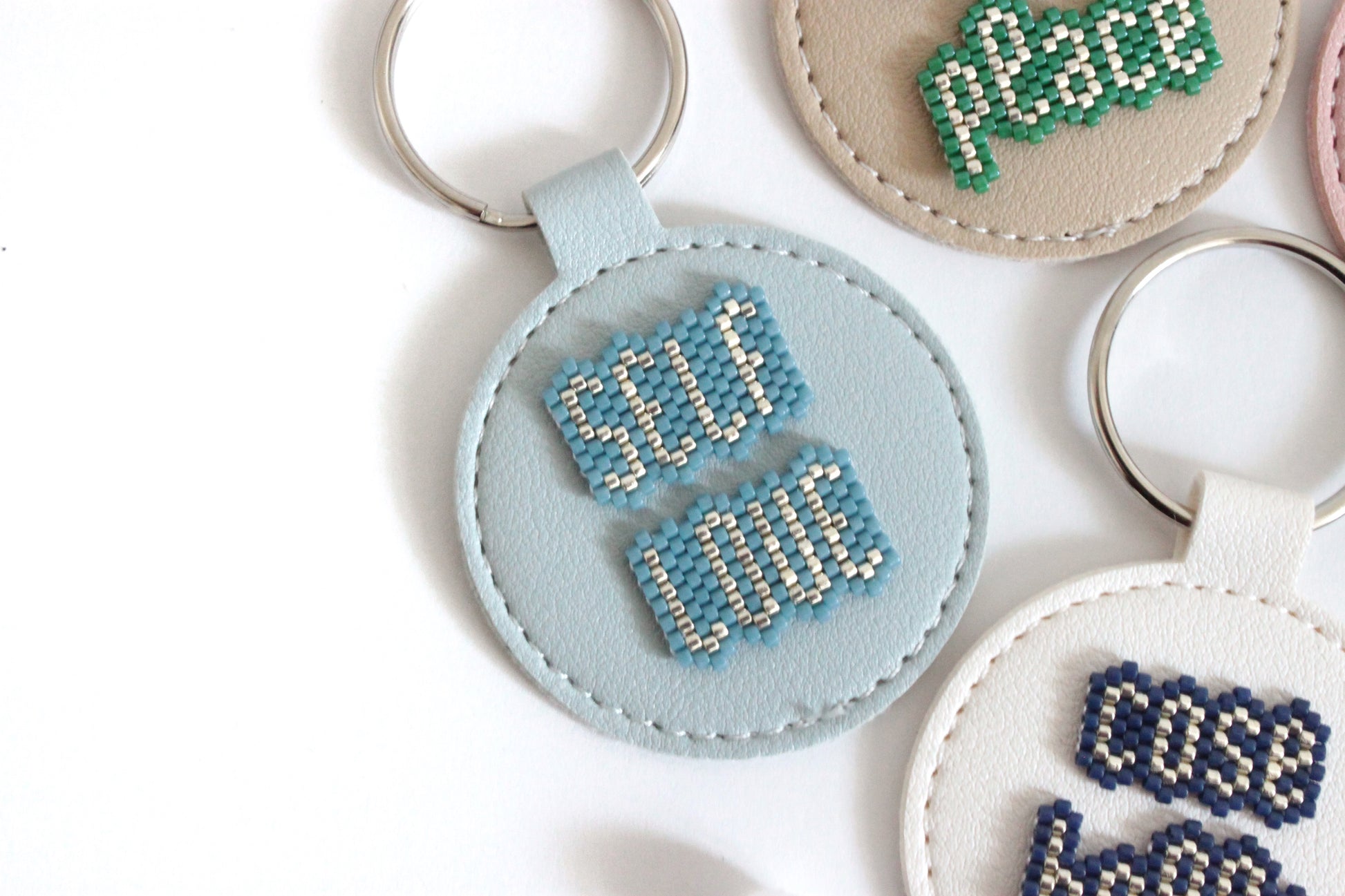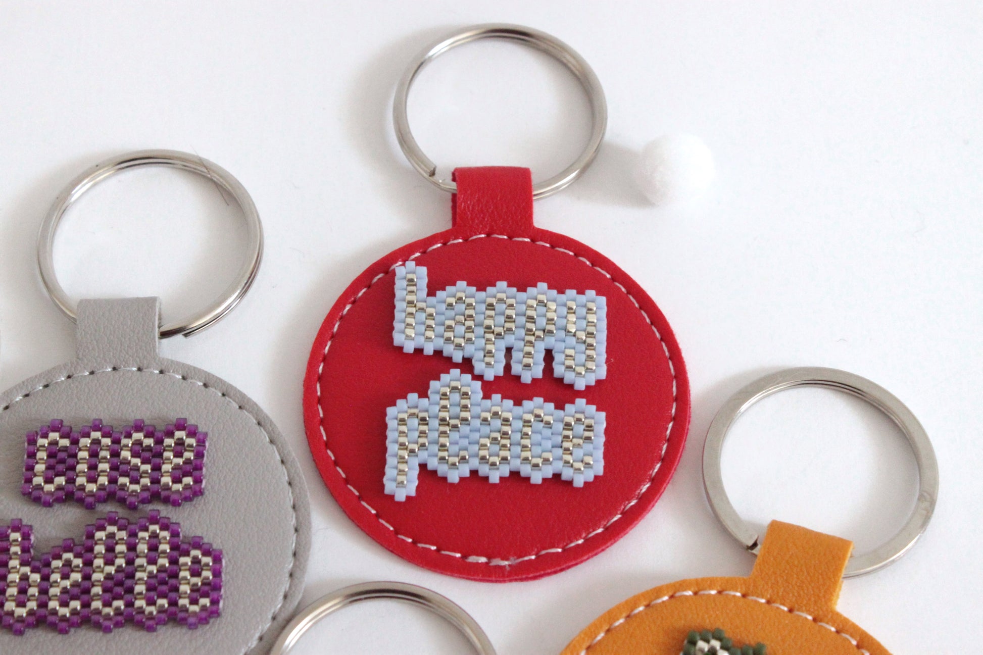 Portachiavi in ecopelle tondo, con parola o frase motivazionale da portare sempre con te, in tessitura di perline giapponesi.