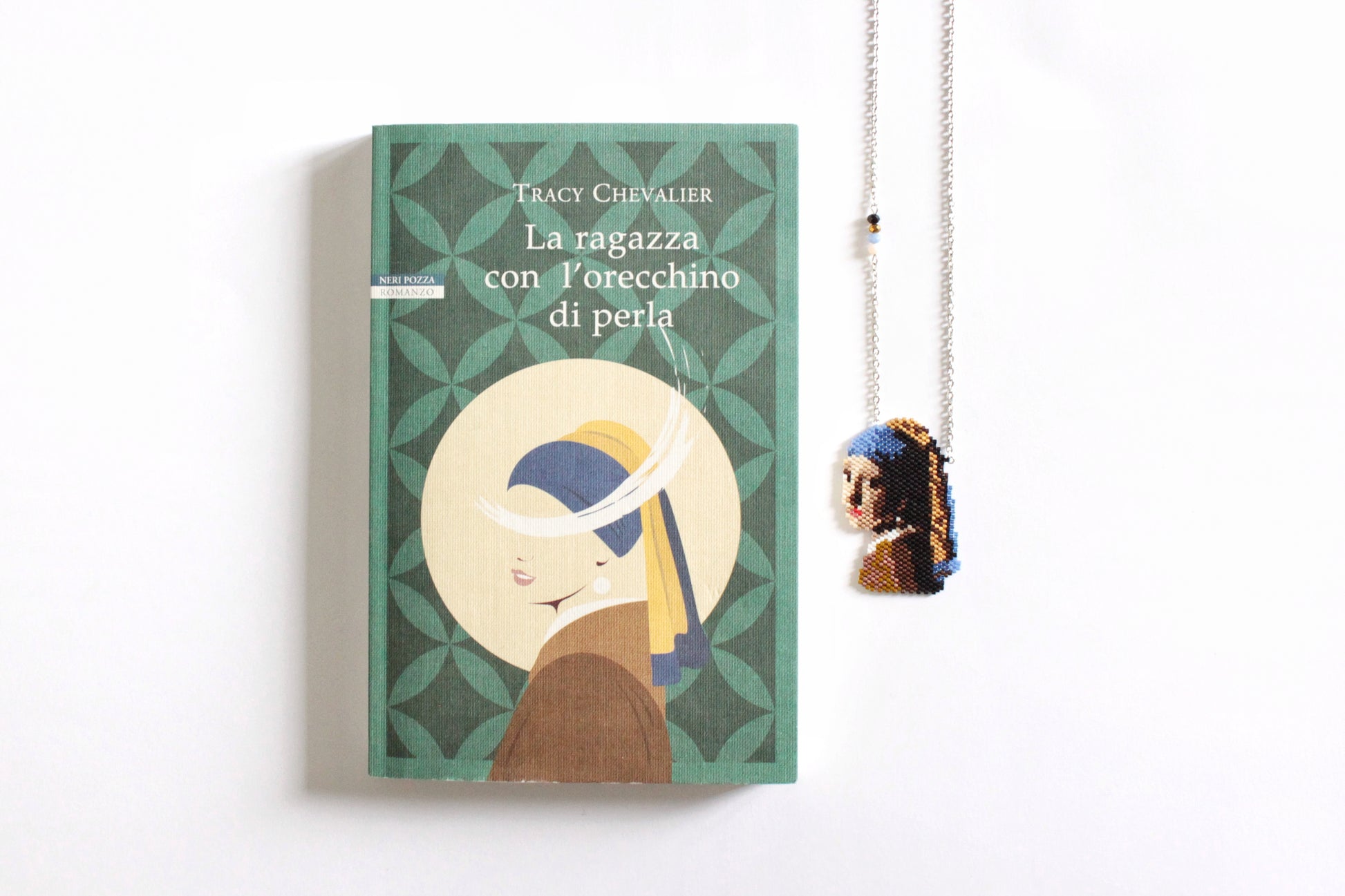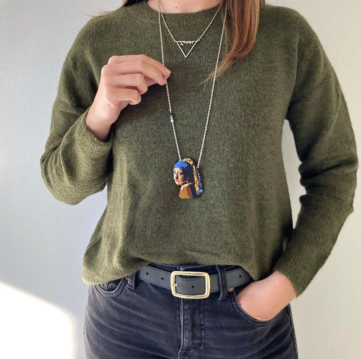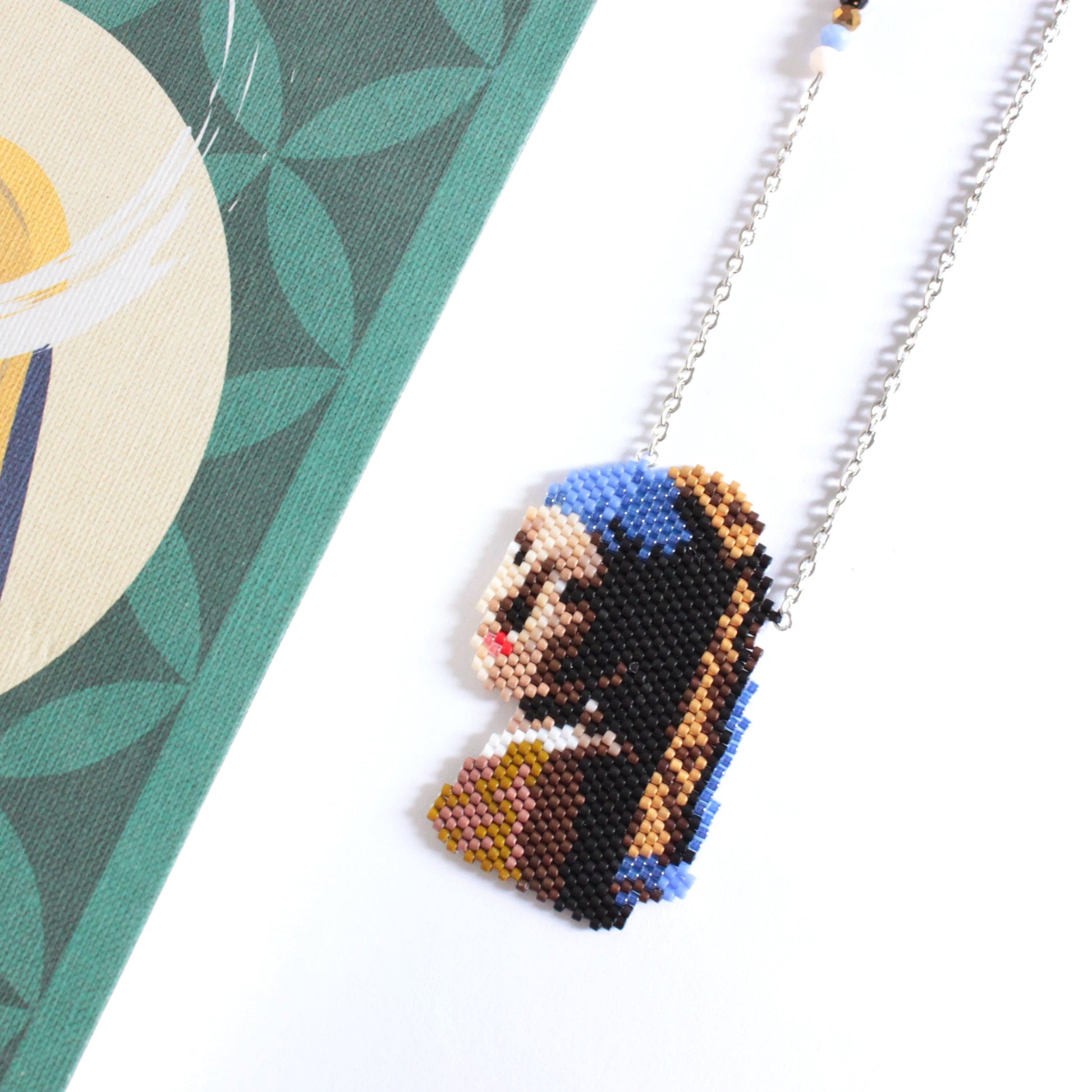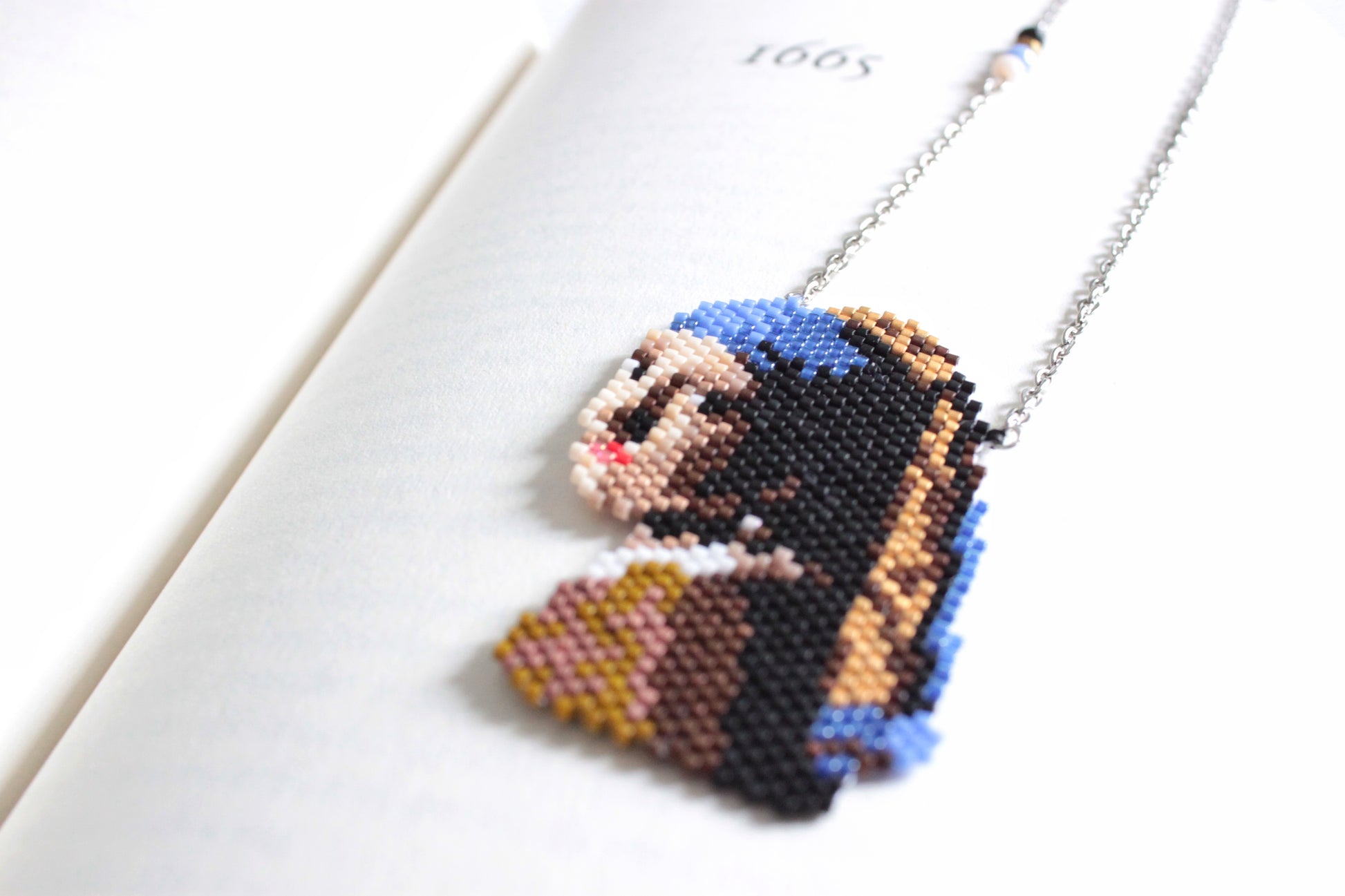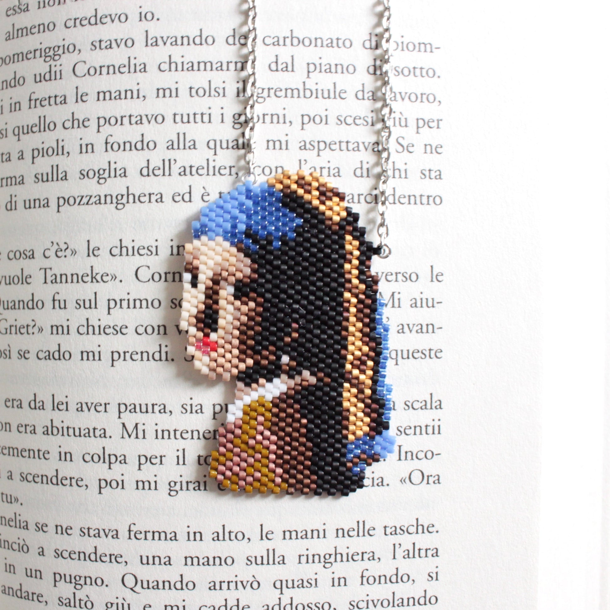 Ciondolo raffigurante La Ragazza con l'Orecchino di Perla, celebre protagonista del dipinto di Jan Vermeer, realizzato in tessitura di perline giapponesi delica Miyuki.